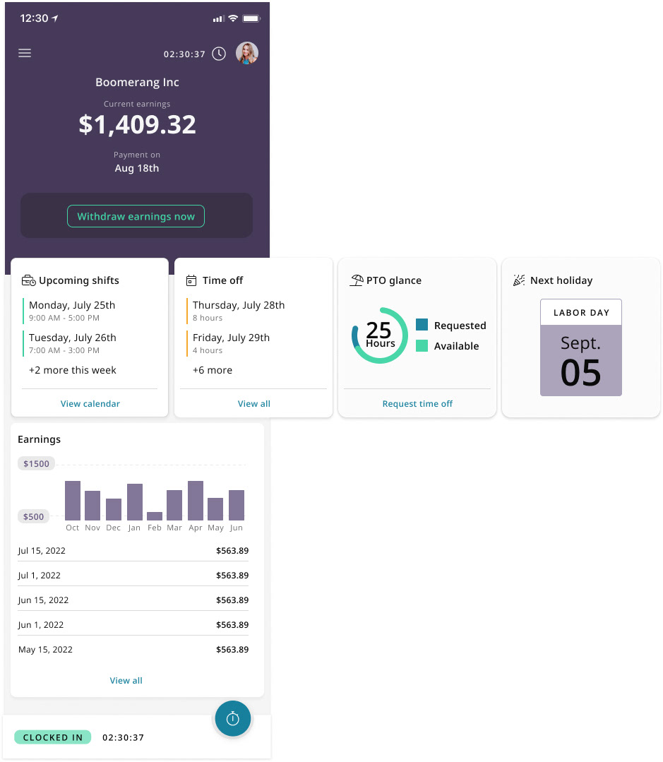 Due to some banking limitations, fee structures and laws about Earned Wage Access, we had to design this for workers to cash out their full amount up to $250.00. We also wanted to show a clear view into their monthly financial earnings and easier widgets for their upcoming shifts, time off and PTO balances.